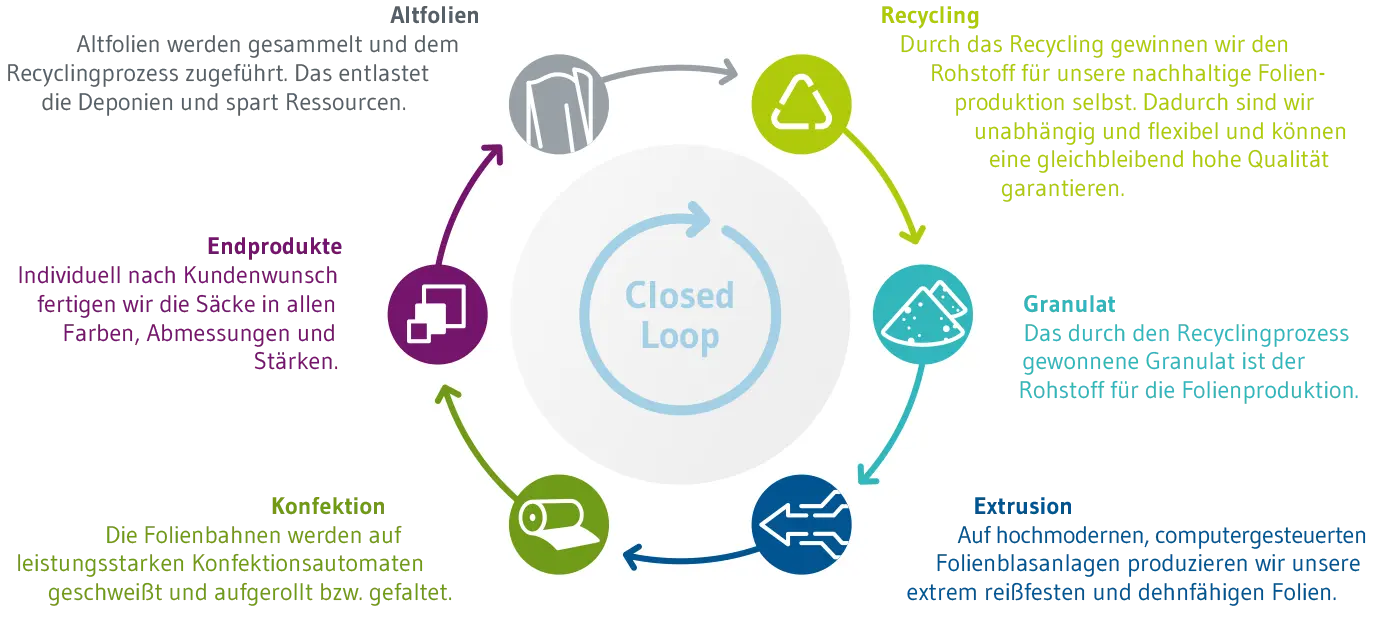 Seit der Unternehmensgründung vor über 35 Jahren setzen wir auf die Herstellung nachhaltiger Folienprodukte. Aus Überzeugung und mit höchster Konsequenz. Jeder einzelne von uns produzierte Folienbzw. Abfallsack besteht zu 100 Prozent aus Rezyklat, das wir zuvor in unserer eigenen Recyclingabteilung aus Altfolien zurückgewinnen. Das gibt uns nicht nur über sämtliche Prozessschritte die optimale Qualitätskontrolle, es macht unsere Folienprodukte auch doppelt nachhaltig. Denn das von uns zu Granulat aufbereitete Altmaterial würde andernfalls in der Verbrennung landen und damit als Rohstoff für immer verloren gehen.